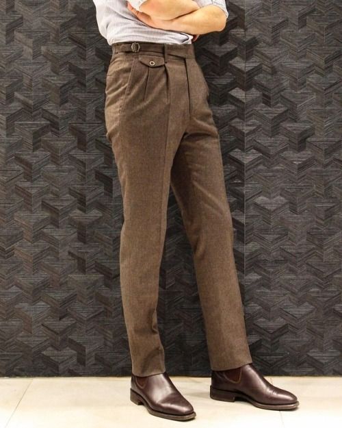 Classic Gurkha slim fit two pockets on the back and front ticket pocket double buckle flannel brown pants made from premium fabric.